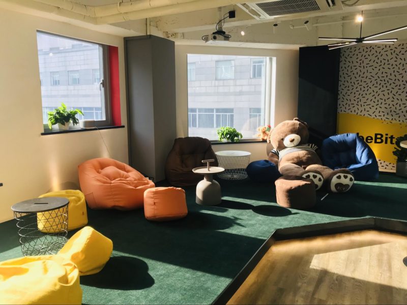 大きなクマのぬいぐるみがうたたね(?)しているカーペットスペースも。ここで食事をしたり休憩したり、あるいは気分を変えて作業をしている社員もいるようです。