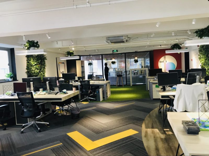 入口を入るとすぐ、ビービットの大きなロゴと白い馬がお客様をお出迎えします。このオフィスをプロデュースして下さったデザイナーさんのお名前に「馬」が入っているそうで、デザインした場所には必ずどこかしらに馬をあしらうのだそうです。