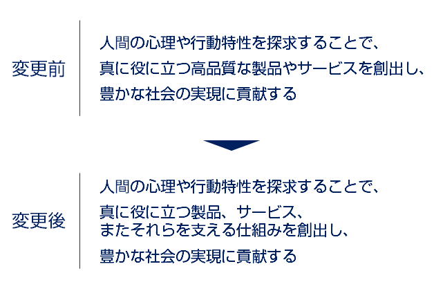 変わったのは2行目です。「真に役に立つ高品質な製品やサービスを創出し」から、「真に役に立つ製品、サービス、またそれらを支える仕組みを創出し」に変更しています。