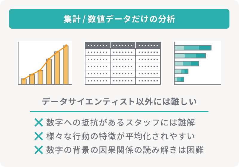 しかし、このデータを全て利用するために、数値としてまとめて集計しただけでは、多くの現場スタッフは利用しなくなります。そもそも数字への抵抗がある、様々な行動の特徴が平均化されやすく構造が把握しづらい、数字だけから背景の因果の読み解きを行うのは難しい、といったようなことが理由です。