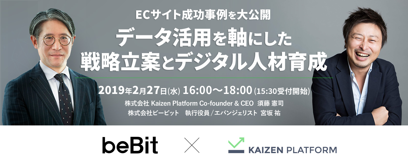 2019年に対応すべきデジタル戦略、そして、それを企画・実行する人材をいかに育てるのか。 本セミナーでは、株式会社 Kaizen Platform、株式会社ビービットより、最新の事例をもとに、成功の鍵となったデータ活用についについてご紹介します。