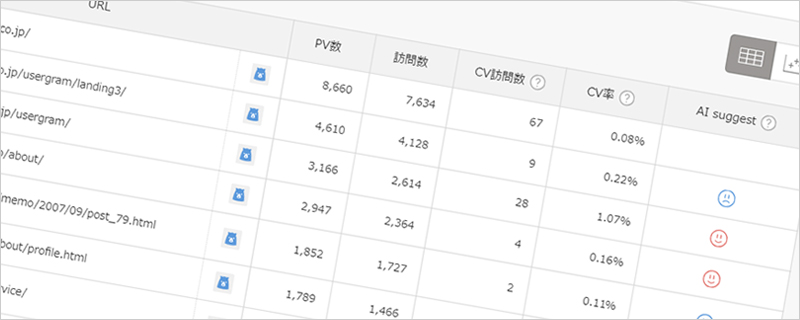 AI suggest機能(β版)は、ページや流入元のCV貢献度をAIが判定し、アイコンで表示するという機能です。目視では気付きにくいサイト改善のヒントを提供します。