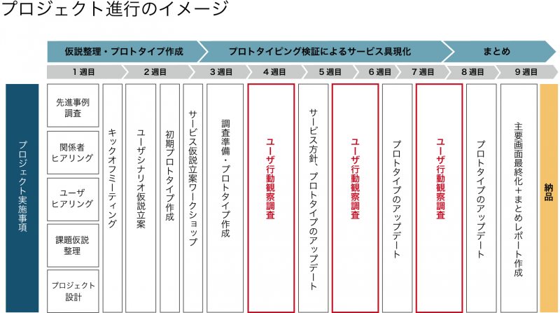 体験設計が出来るまでの大まかな流れとしては、「ユーザ行動観察調査」→「仮説を立てる」→「仮説を基にしたプロトタイピングをユーザに試してもらう」というループですね。