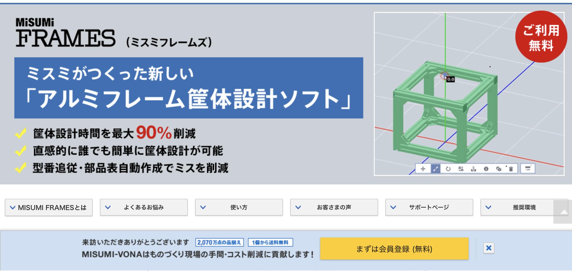 - 対象プロダクト:MISUMI FRAMES (工場設備・装置のカバー・架台などで使用するアルミフレームの設計・発注ツール)