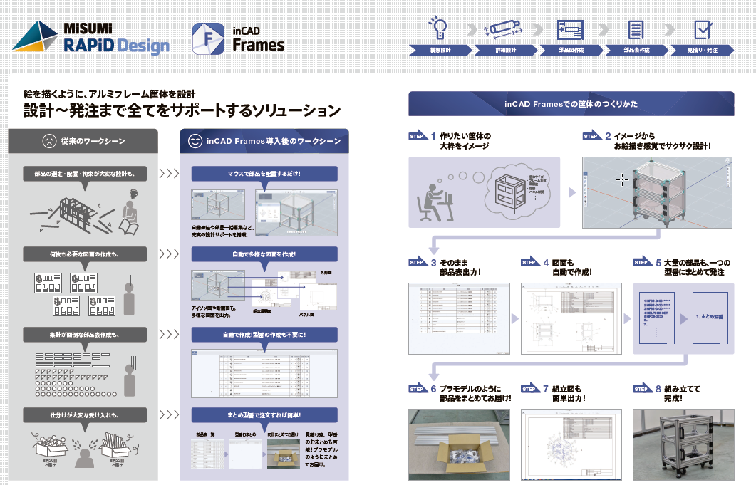 「MISUMI FRAMES」はこれまでCADと呼ばれる設計ソフトを利用して設計していた方から、設計初心者の方まで幅広いユーザに利用してもらうことを狙って、アルミフレームの設計、図面・部品表作成、部品発注・購入がワンストップで行えるサービスとして開発が進められていました。