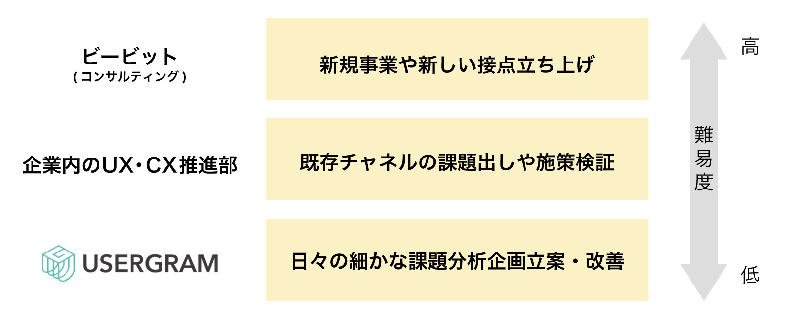 調査を重ねる中で、トピックによる難易度の違いがわかってくるようになります。新規事業のコンセプト策定、新規アプリのリリース前検証等、新サービス・チャネルの検証は難易度が高いため、ビービットをスポット的に利用していただき、リリース後のアプリの課題把握や、改善案の検証のような、既存チャネルの改善については自社内で内製化することをおすすめしています。