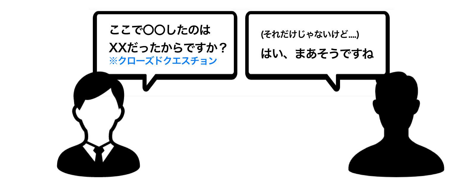 例えば、ヒアリングにおいては質問の仕方が重要です。質問の種類には、2種類あります。クローズドクエスチョンとオープンクエスチョンです。クローズドクエスチョンは、yes/noで答えられる質問であり、オープンクエスチョンは、「どう思いましたか?」等の、制約なしに自由に答えられる質問のことです。