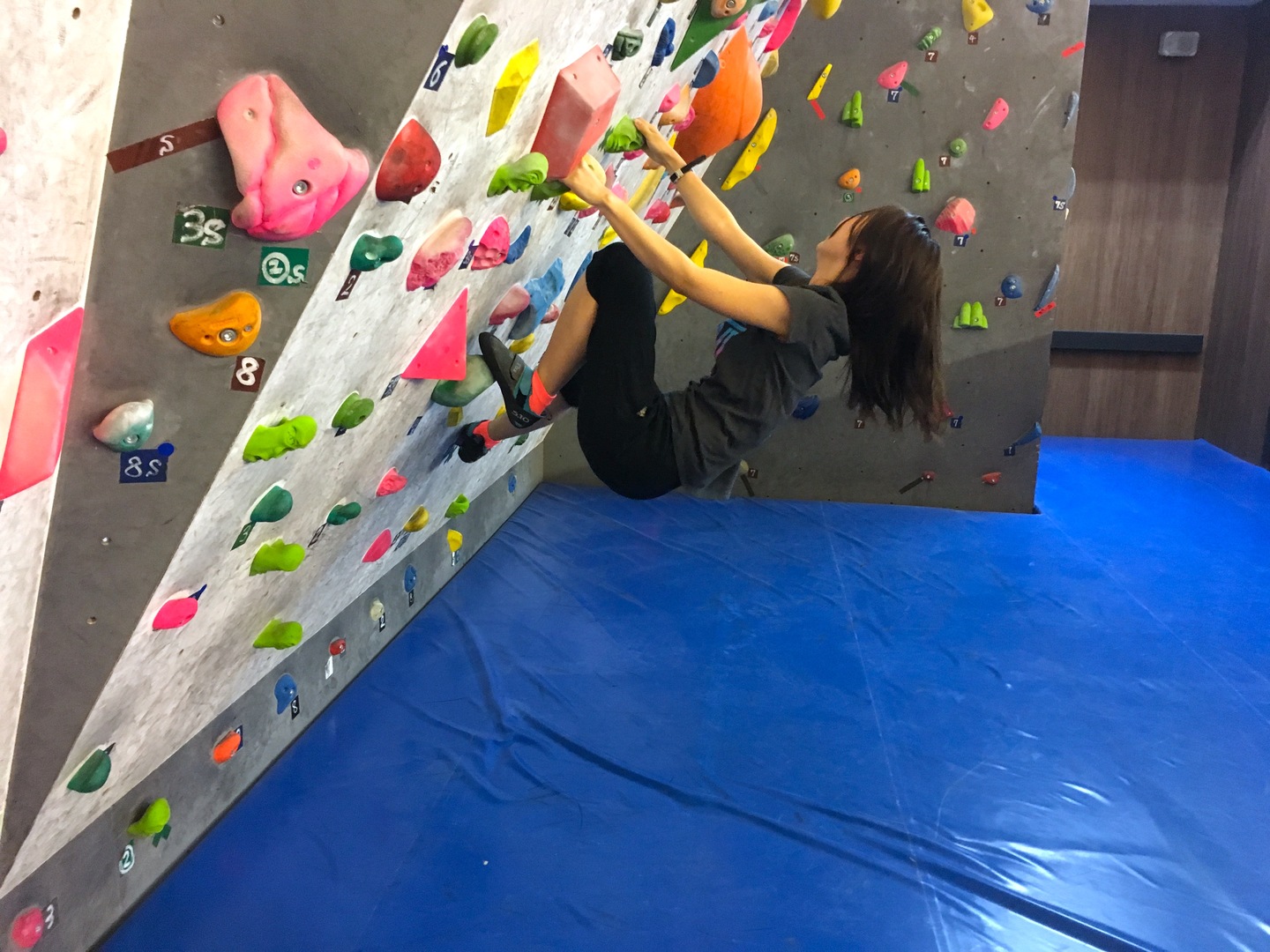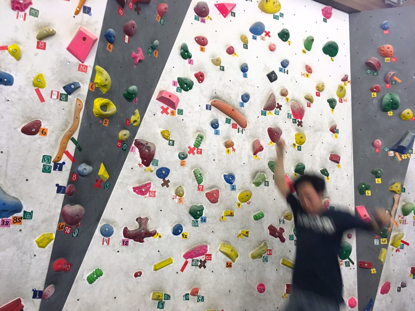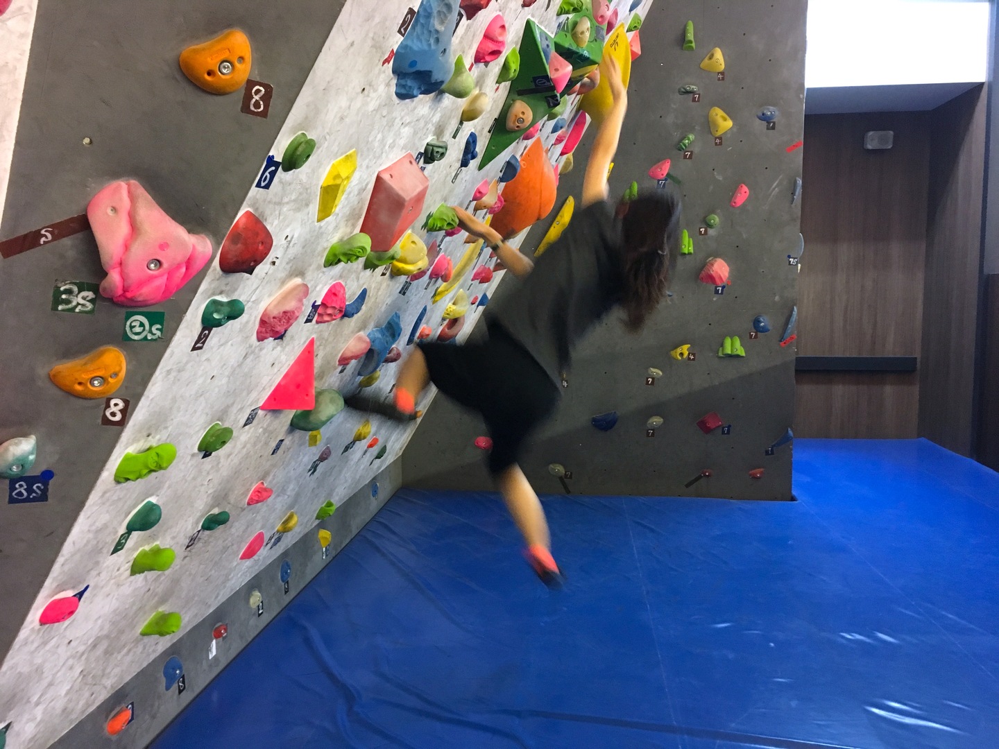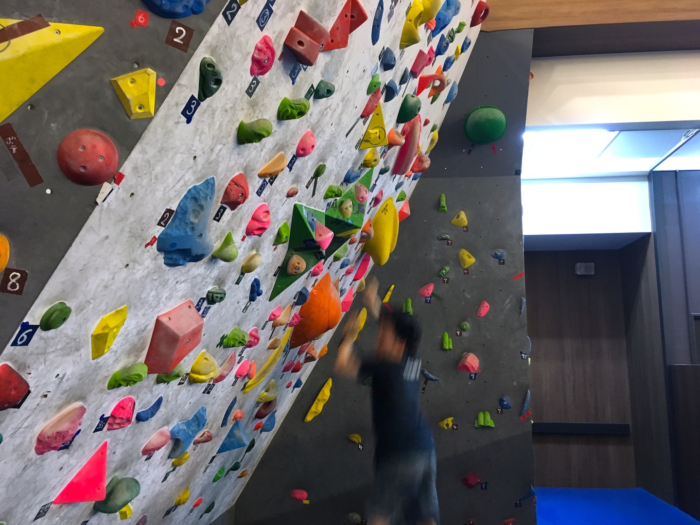 あっという間にゴールに到達。見てると簡単そうなんですけどね…。ボルダリングの不思議なところは、自分の能力にちょうどいい、あるいは少し簡単なコースだと楽しいのに、難易度を上げたとたん、高さも壁も急に怖くなるんですよね…。(怖い怖いと言いながら、その高さから飛び降りているので、矛盾もいいところなのですが…)