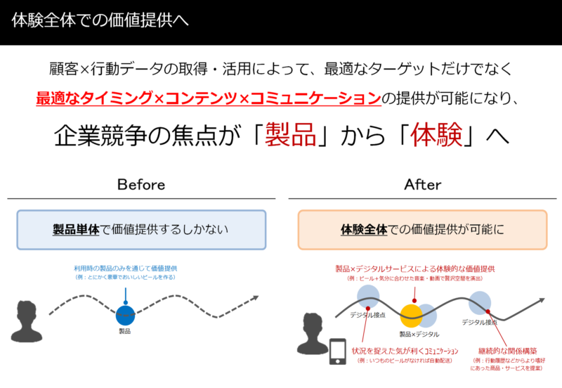 そうなると、ユーザ行動の文脈が可視化できるようになり、ユーザの「状況」を捉えられるようになります。属性ターゲティングの時代には商品とターゲット属性のマッチング最適化が求められていましたが、状況を捉えられるようになると、最適なタイミングで、その人に合ったコンテンツを、その人に合ったコミュニケーション方法で伝えることが可能になります。これは、企業競争の焦点が製品による価値提供から体験全体での価値提供へと変化することを意味します。