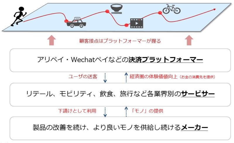 代わりに産業構造のトップにあがるのが、ユーザとの接点を高頻度・大量、かつ業界を横断して持っている、つまりユーザのことをよく知っている、決済をはじめとする行動データを抱えた「プラットフォーマー」。アフターデジタルな世界では、こうした産業構造の大きな変化が起きるのです。