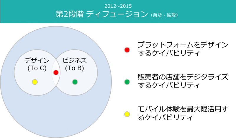 「第2段階目は、第1段階にお話ししたデザイン・ビジネス・テクノロジーにおける、ビジネスオペレーション側のエクスペリエンスデザインを磨きこんだ段階を指します。我々はこれをディフュージョンと呼んでいます。