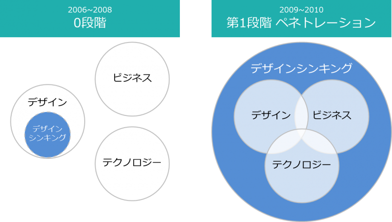 2009年、これでは不十分と考え、デザインとテクノロジーとビジネスを等しくデザイン・シンキングが包括するような形に捉えなおすようにしました。この3つの要素を全てデザイン志向で考えるという変化を第一段階とし、ペネトレーションと呼んでいます。」