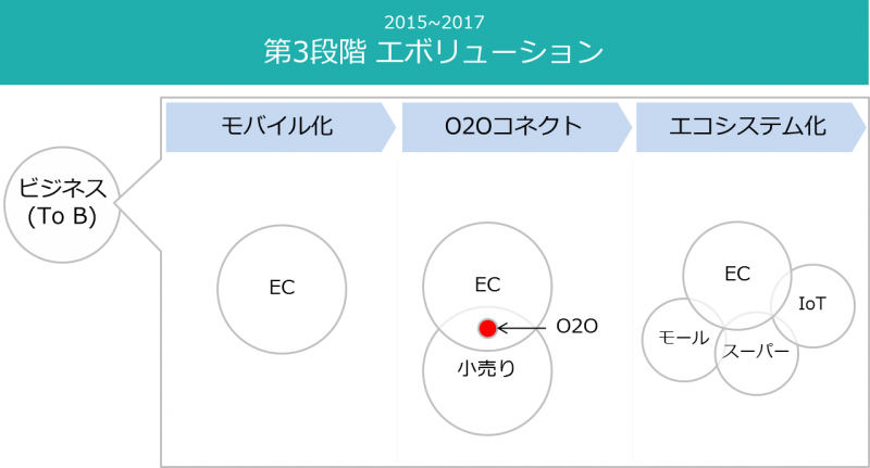 「2015年以降から始まる第3段階目はEvolutionと呼んでいるもので、それこそ新小売(ニューリテール)のような話です。アリババはECが主要事業ですが、例えばこのECやオンラインサービスの方法論を、小売業のような既存型ビジネスに応用して再構築をすると、新たな価値提供をすることができます。