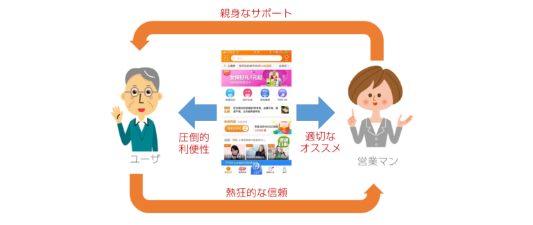 この途方もないユーザ数を抱えたアプリ、平安保険はただ社会貢献のために作ったわけではありません。実は保険加入のための最初のタッチポイントになっています。とはいっても、便利なアプリがあればユーザが喜んで保険に加入してくれるわけではありません。鍵は保険の営業マンです。