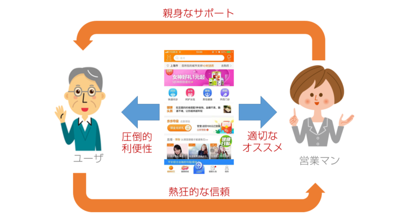この途方もないユーザ数を抱えたアプリ、平安保険はただ社会貢献のために作ったわけではありません。実は保険加入のための最初のタッチポイントになっています。とはいっても、便利なアプリがあればユーザが喜んで保険に加入してくれるわけではありません。鍵は保険の営業マンです。