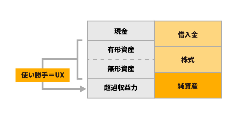 これまで超過収益力の根拠としては、その会社独自の「人材、ブランド、技術、ノウハウ」が挙げられていました。でも今お話した考え方からすると、これらはUXをつくるために必要な構成要素だと捉え直すことができるんです。