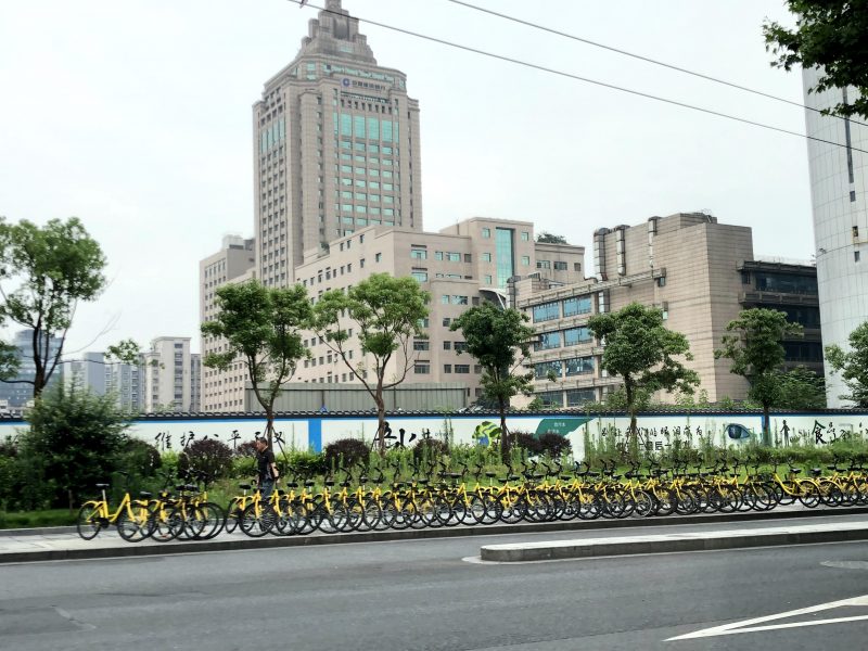 街中に、普通に置いてあるシェアサイクルについているQRコードをアプリで読み取ると、シェアサイクルのカギが、触ることなく開きます。好きなところまで乗ると、非常識でない場所であれば好きなところに乗り捨てられます。30分乗って、1元(16~17円)です。