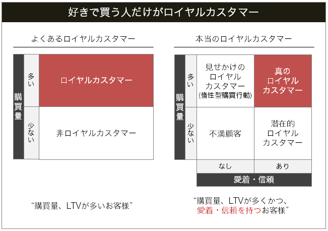 しかし、実は顧客の購買行動だけに注目していては、冒頭に挙げたロイヤルカスタマーの定義を満たす顧客は正しく識別できないことが明らかになりつつある。