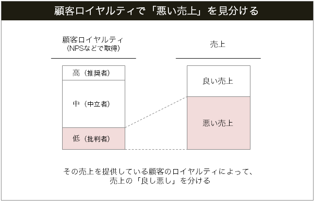 また、自社の売上に占める「悪い売上」の実態をデータで把握したい場合には、自社の顧客に関してロイヤルティをアンケートなどによって調査し、一人ひとりの収益データと紐づけてみるとよい。ロイヤルティが低い顧客から得ている売上の合計、これが「悪い売上」である。
