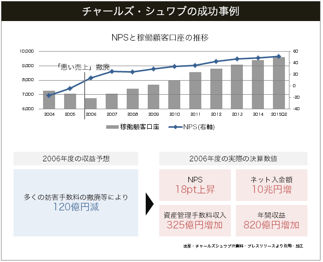 しかし、一時的な売上を減らしてでも顧客志向を追求するこのような施策は、たとえ思いついたとしても通常の企業では意思決定が難しいからこそ、顧客が証券会社に対して抱いている期待を大幅に上回ることができる。これらの施策はチャールズ・シュワブに対する顧客ロイヤルティを高め、最終的には当初の予想に反して、820億円の収益増加をもたらす結果となった。