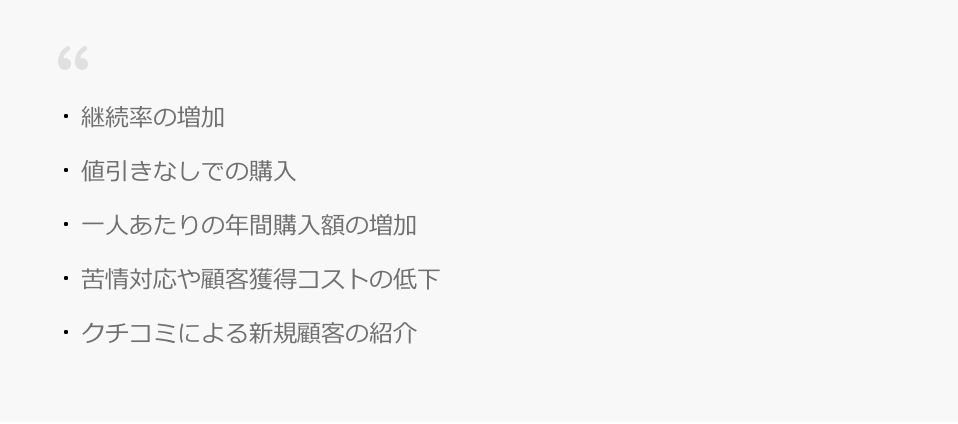 また、ロイヤルカスタマーは収益以外の面でも企業に対して下記のような効果をもたらす。