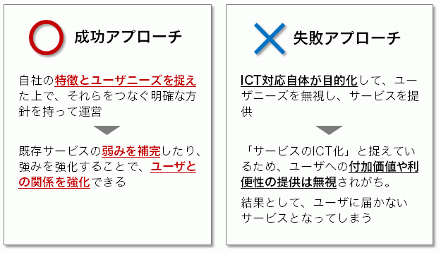成功企業のICT活用において共通しているのは、「現状サービスでは満たせないユーザニーズを補完」する形で新しいサービス開発を行なっている点にある。単に既存のコンテンツをデジタルに置き換えただけではなく、既存コンテンツとデジタルコンテンツをうまく組み合わせることで教育効果を高めるより進化したサービスが提供されている。