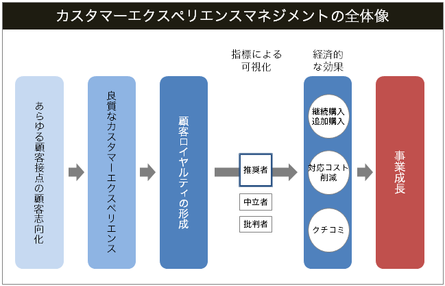 このようなカスタマーエクスペリエンス向上からロイヤルカスタマー創出に至る一連のプロセスを全社として統合的に管理していくための手法を「カスタマーエクスペリエンスマネジメント」と呼ぼう。