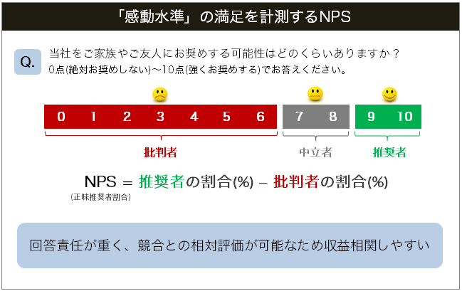 - 満足度調査では特に不満がなければ「満足している」と答える場合が多い。一方、「すすめますか」と尋ねられた場合は、すすめた相手に対してその商品やサービスの質を担保する責任を感じるため、より精度の高い評価を得ることができる