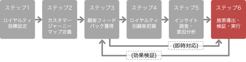 導入フェーズではこの6ステップを経て施策を実施することで、ロイヤルティ向上の必要性を社内に説明するための成功事例を作ることが目標となる。