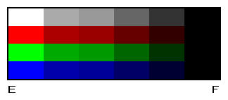 可読性を高める上でもっとも重要とされるのが明度です。明度とは、その色の明るさを表します。下記のE,Fは同色ですが、Fに近づくにつれて暗くなります。