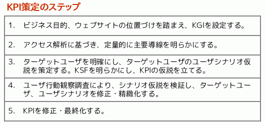 逆にいえば、以下のようなステップを踏むことにより、KPIを策定していくことが可能となります。