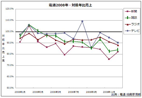 昨年2008年は、マスメディアへの広告出稿を削減する動きが各業界で見られました。広告代理店である電通や博報堂が発表している月次売上高からも、紙媒体への出稿が前年比20%-30%減といった急激な減少傾向が見て取れます。テレビ広告でも同様の傾向を示しており、特にスポット広告は2008年は各社前年比10%-20%減と顕著な落ち込みとなりました。