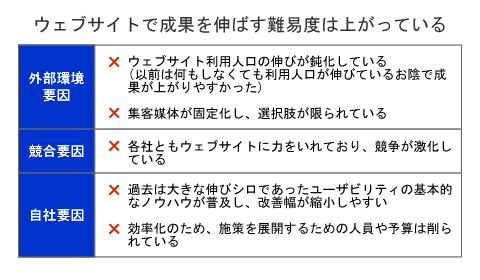 - ウェブサイトで成果を伸ばす難易度は上がっている。