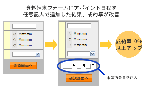 例2)「資料請求フォームにアポイント日程を任意で追加したら、約1/3の方が入力をしていただき、その日程でアポイントを設定するようにしたら、結果として成約率が10%以上改善した」