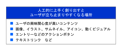 「人工的に上手く創り出すと、ユーザが立ち止まりやすくなる場所」