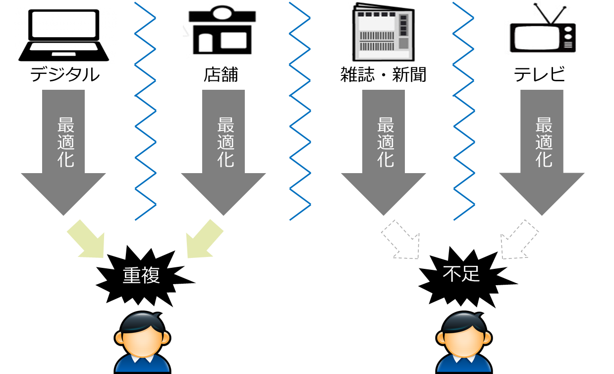「個別の接点を最適化するのとどこが違うのか」と思った方もいるかもしれない。しかし、カスタマージャーニーマップ作成時にこの視点を持つことで、個々の接点ごとの課題だけでなく、利用体験全体を通じた課題が見えやすくなる。例えば、あるケーブルテレビの企業では、ウェブサイトや工事申し込み・コールセンターなど個々の接点では最適な顧客対応をしており、顧客満足度も高かった。しかし、チャネル間での情報の連携が不十分であったため、契約プロセスを進めるにつれて、顧客は以前話したことを何度も説明しなければならず、全体として大きなストレスと不安をためていたという。
