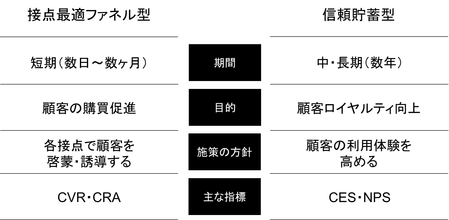 ビービットでは、カスタマージャーニーを設計するときの思想は大きく2種類あると考えている。「接点最適ファネル型」と「信頼貯蓄型」である。前者のような、ファネルに近いカスタマージャーニーが有効であることも多いが、後者の思想がなければうまくいかない場合もある。