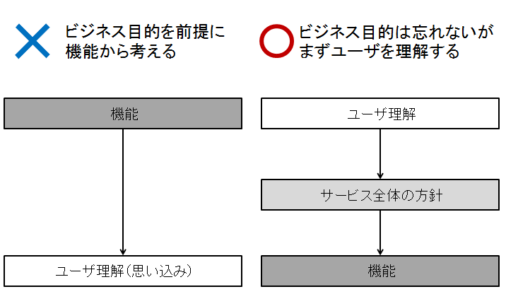 この提案のどこに問題があるか分かるだろうか。最大の問題は「顧客接点が増えるような機能は何か」という切り口のみで考えてしまっている点にある。銀行アプリの家計簿を本当にユーザが使いたいと思うのか分からないまま、ビジネス目的の達成だけを主眼にサービス設計を進めようとしてしまったのである。(図2参照)