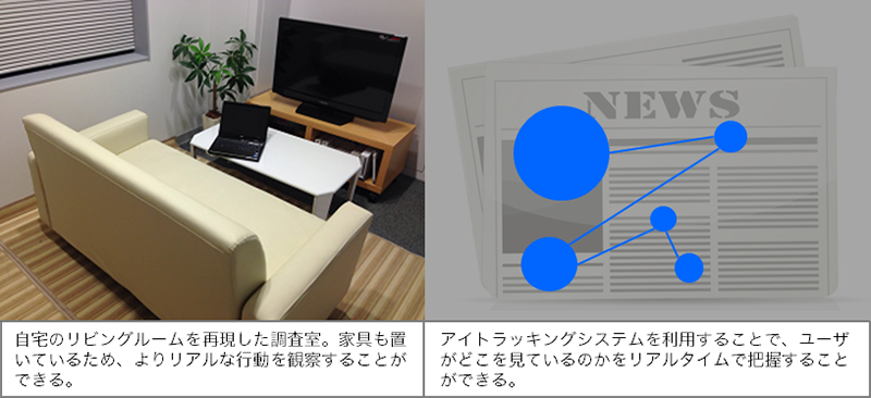 ユーザ行動観察調査では、ある商品やサービスの検討ユーザや使用ユーザを調査室に呼び、自宅のリビングルームを再現したリアルな状況で、それを検討する様子や使用する様子を観察する。その際に、アイトラッキングシステムを使ってユーザの目線の動きを把握することで、ユーザが無意識下でとっている行動までも引き出すことができる。