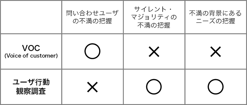 VOCでは「幅広いユーザの声を収集できず、一部のユーザに偏ってしまう」、インタビュー調査では「言語化・意識化したニーズしか捉えられず、真のニーズを見逃してしまう」という欠点がある。では、ユーザ行動観察調査ではこれらの点はどうだろうか。