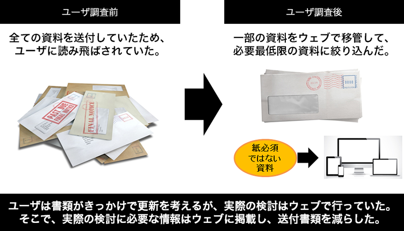 しかし、ユーザ行動観察調査の結果、実際には継続案内書以外のほとんどの書類がユーザに読み飛ばされていることが分かった。また、プラン変更の検討は、書類ではなくウェブ上で行われていることが分かった。