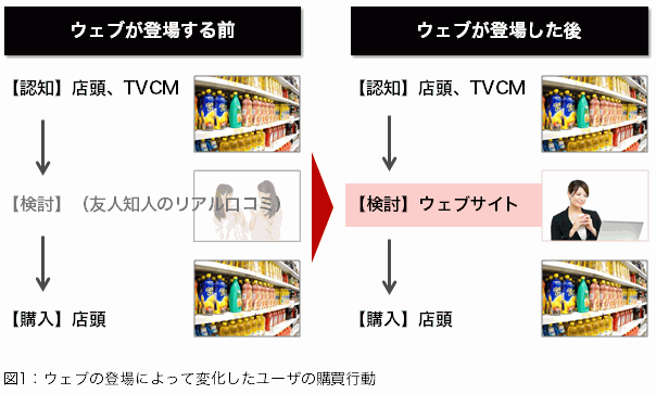 ウェブが登場するまで、消費財の購買行動はテレビCMや店頭で製品名を認識し、友人・知人の口コミなどをもとに検討、店舗で購入というステップが一般的であった。しかし、ウェブの登場によってユーザの購買行動ステップは変化をみせている。