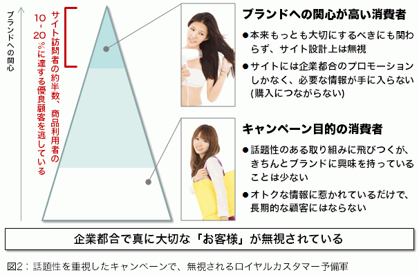 しかし、一般の消費財メーカーのウェブサイトはプロモーション情報が多く、ロイヤルカスタマー予備軍が欲している情報がすぐに手に入らないことも多い。その結果、彼らの購買意欲を高めることができず、大きな機会損失が発生している(図2)。