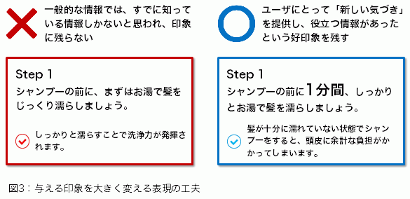 この表現を「シャンプーの前に1分間、濡らすのがポイント」と工夫すると、ユーザには「1分くらい濡らさなきゃいけないんだ」という「新しい気づき」があり、ウェブサイトを見ていて役立つ情報があったという印象を残すことができる。比較的、低価格帯の消費財の場合、このちょっとした印象の差が購入する製品の違いにつながることもある。(図3)