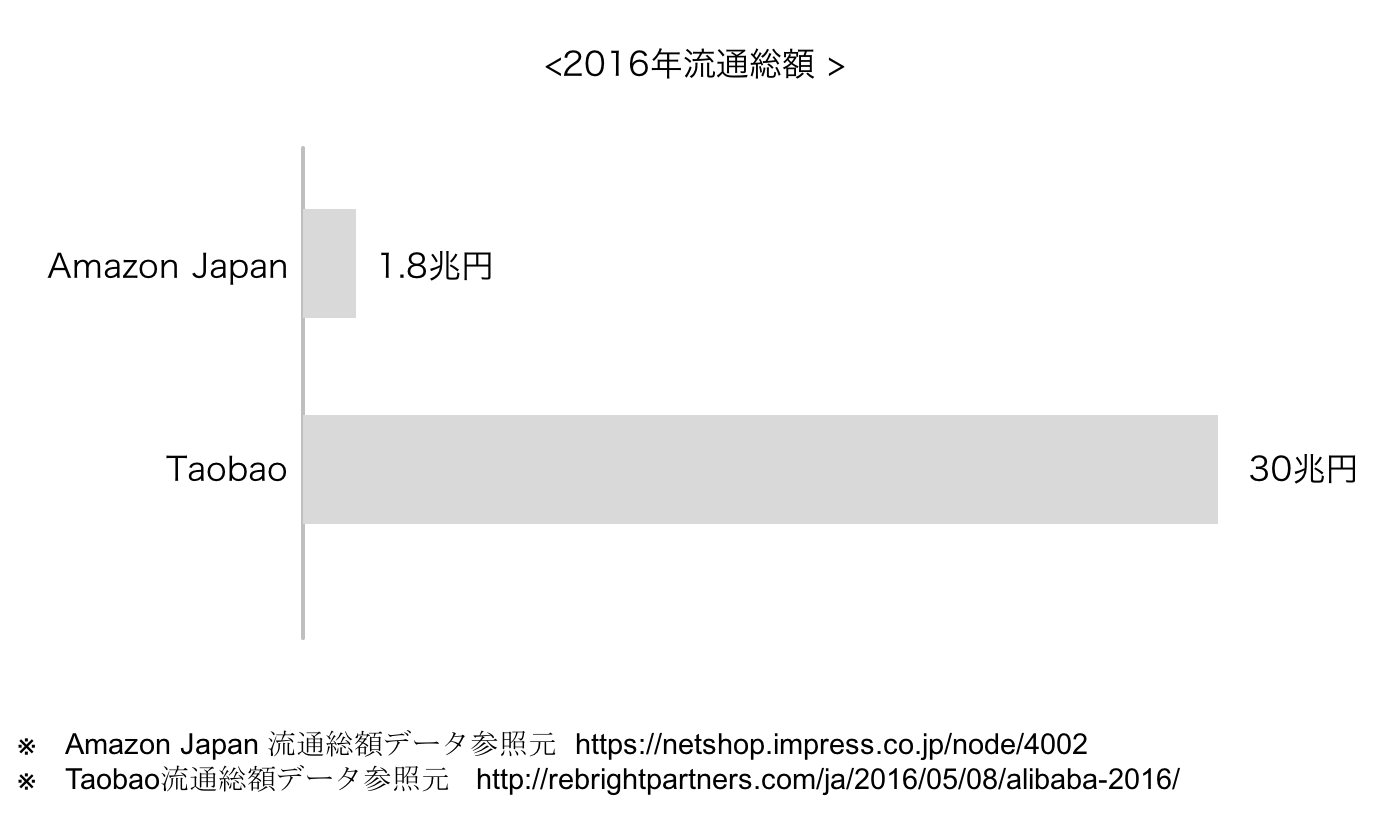 また、流通総額で比較しても、Taobaoの流通総額はAmazonの15倍以上と推定されています。