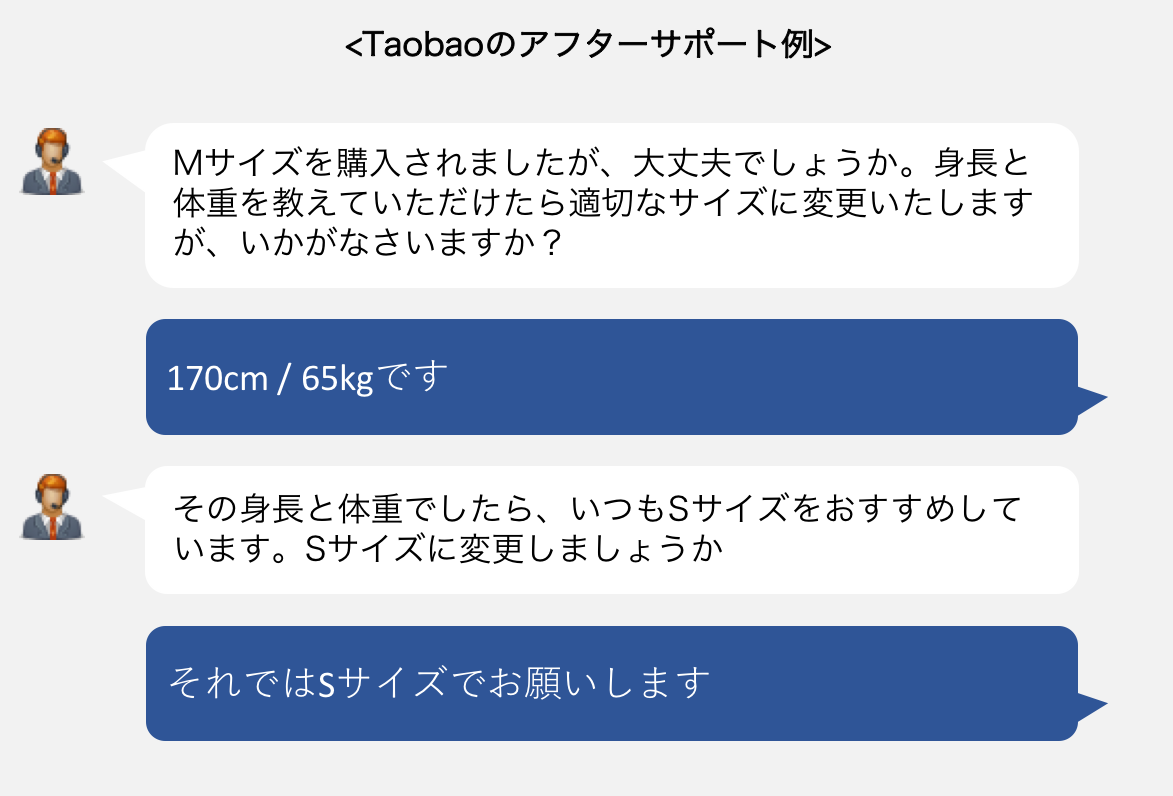 上記はあくまで一例ですが、Taobaoでは24時間のチャットサポートが受けられます。それも、普段利用するチャットアプリでやり取りをするので、簡単です。 Bさんの場合、衣服を購入したあと、チャットサポートでサイズ変更の提案を受け、そのチャットだけでサイズ変更手続きを完了させることができたのです。