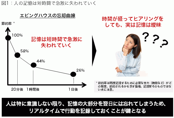 ドイツの心理学者、ヘルマン・エビングハウスの忘却曲線は「人間の記憶は最初の1日で急激に失われる」ことを示唆している。この記事を読まれている方も、「先週1週間、スマートフォンをどのように利用したか/どんなサイトを見たか」という質問に正確に答えることができる方はほとんどいないのではないだろうか。