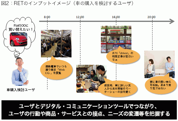 ビービットでは、ユーザのマルチデバイス・マルチメディアにまたがる行動を把握するために、リアルタイム・エクスペリエンス・トラッキング(Real time Experience Tracking: RET)という手法を用いている。