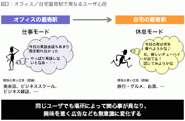 著者自身にも覚えがあるが、やはりオフィスの近くでは「しっかりしなくては」という気持ちが強くなる。いわば、「仕事」のマインドシェアが高い。そういう状態では、自然と「しっかりしなくては」というニーズに応える情報が入りやすい情報になるのである。これは、広告の出稿配分の最適化に寄与するデータとなる。