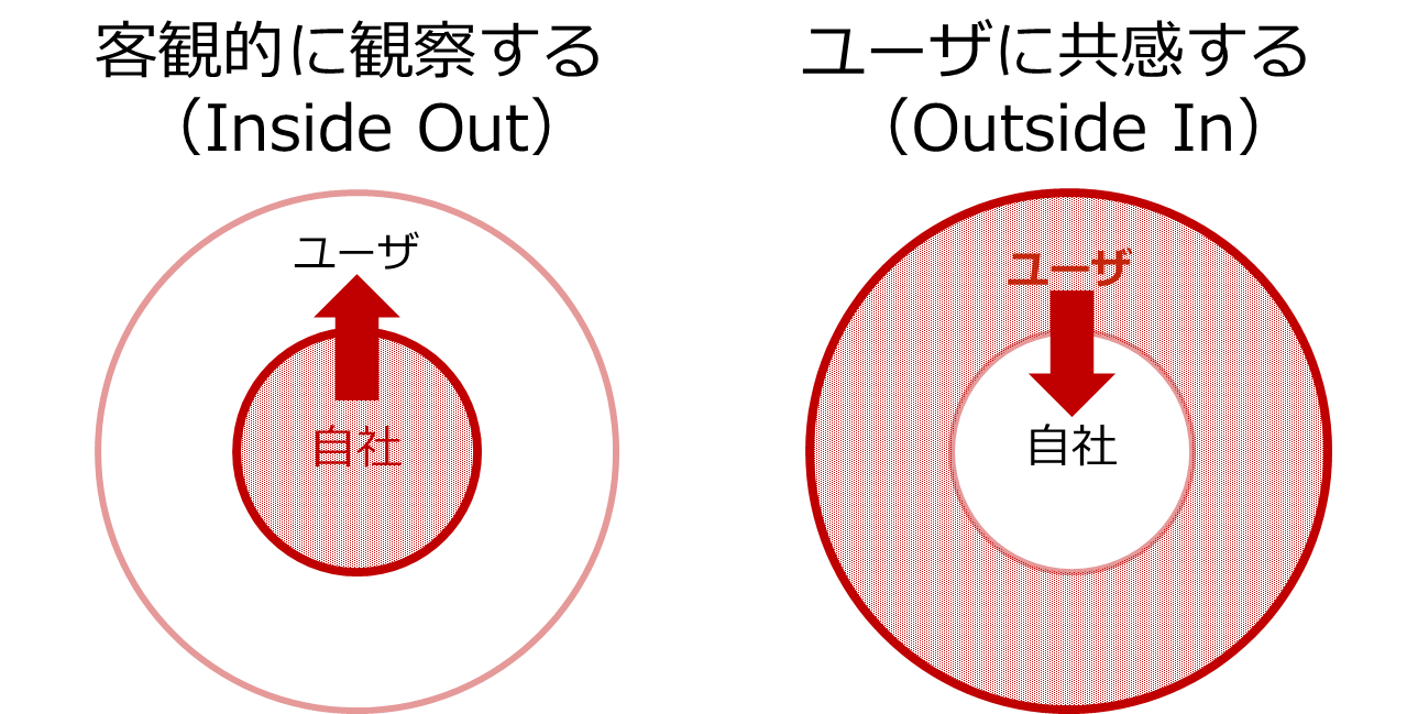 これは、Inside Outとは反対に、外から自社を見る視点に立つという意味で「Outside In」といえる。インタビュー用語では、「憑依」や「相手の靴を履く」などという状態に近いだろう。